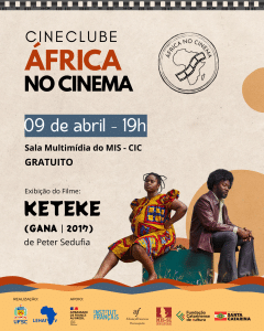 No dia 09 de abril, a Sala Multimídia do MIS/SC, no Centro Integrado de Cultura (CIC), recebe a programação do Cineclube África no Cinema. Na sessão deste mês será exibido o filme Keteke (Gana, 2017), com entrada gratuita. Após a sessão, haverá uma roda de conversa sobre o filme e temas relacionados.