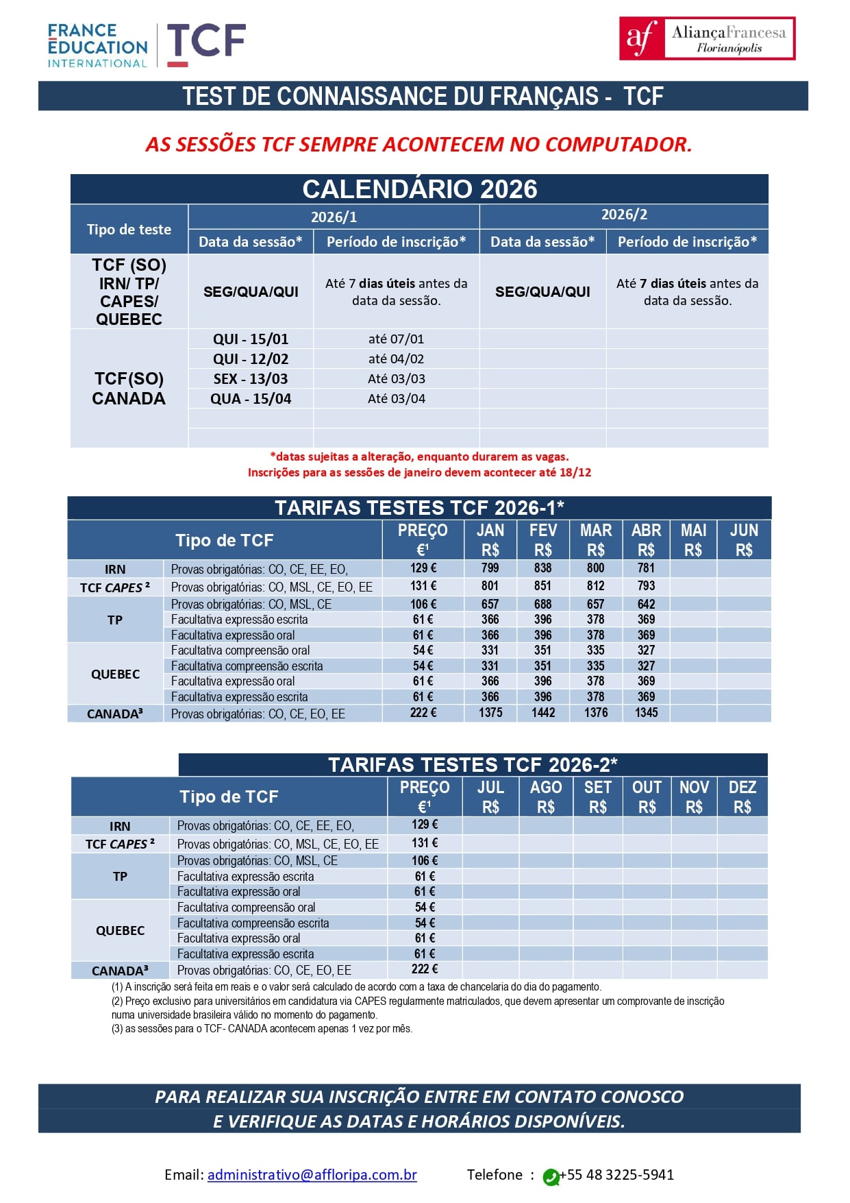 Solicite o formulário e datas disponíveis via whatsapp (48)3225-5941 ou compareça na Aliança Francesa Florianópolis.